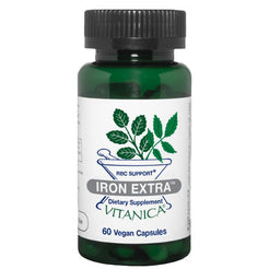 Vitanica Iron Extra supports healthy iron stores with a more absorbable, gentle form of iron. Also provides herbs and vitamins for extra support and wellness. Each capsule contains elemental Iron sourced from ferrous aspartate, ferrous succinate, and ferrous fumarate, which are known for their gentle nature on the stomach and reduced likelihood of causing constipation. Enhanced iron absorption is facilitated by the inclusion of Vitamin C. Traditional herbs like Yellow dock, Dandelion, and Nettles, renowned for their mineral-rich properties, aid in maintaining optimal iron levels in the blood while promoting easier bowel tolerance of elemental iron. A comprehensive approach to supporting and sustaining healthy red blood cells is provided by Vitamins B12 and Methylated Folic acid (L-5-MTHF).