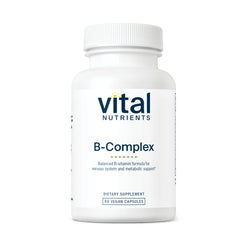 Vital Nutrients B-Complex supports a healthy nervous system, a tonifier in times of mild stress and fatigue, maintains healthy protein, fat, and carbohydrate metabolism, and promotes the conversion of homocysteine. B Complex is used in the metabolism of protein and fats, maintains muscle tone in the GI tract, and helps to convert carbohydrates into energy. Also supports healthy nerve cells, promote the conversion of homocysteine thus supporting heart health.