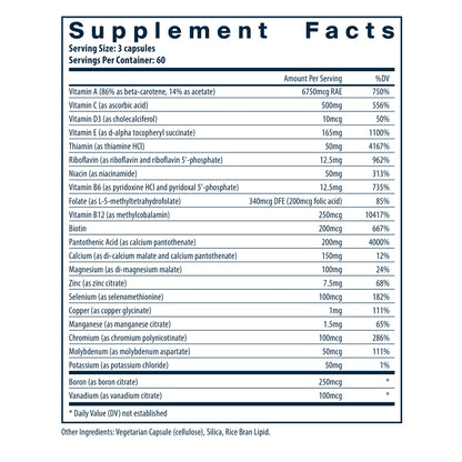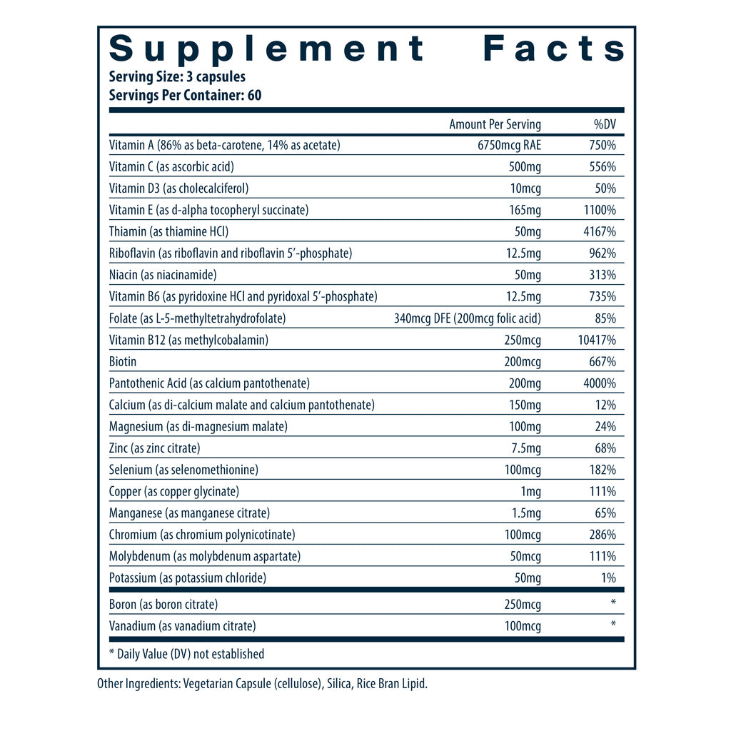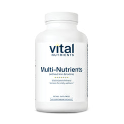 Vital Nutrients Multi-Nutrients (No Iron & Iodine) A high potency multivitamin/mineral and trace element formula that provides the highest nutritional value for all systems of the body. Supports bones, skin, cardiovascular health, liver, and immune health. Vegetarian formula.