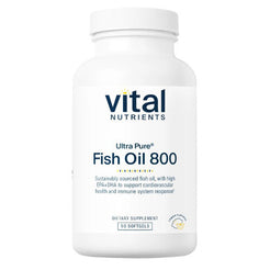 Vital Nutrients Ultra Pure Fish Oil 800 supports soft tissue and connective tissue, and maintains normal platelet aggregation levels. Fish oil provides protection and maintenance of the normal function, fluidity and health of cell membranes. Has a high concentration of EPA and DHA. Lemon Lime flavored softgels.