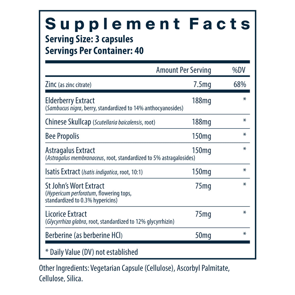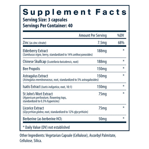 - Elderberry Extract (Sambucus nigra, berry, standardized to 14% anthocyanosides) 188 mg