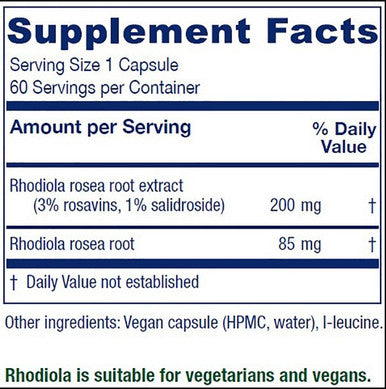- Rhodiola rosea root extract (3% rosavin, 1% salidroside) 200 mg