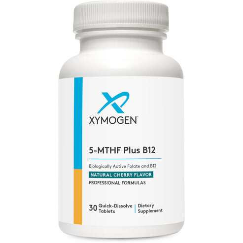Xymogen 5-MTHF Plus B12 Cherry 30 tabs supports methylation, nervous system, normal cellular proliferation (including red blood cells), healthy serum folate levels, and supports a healthy pregnancy outcome. Does not contribute to unmetabolized Folic Acid Accumulation (UMFA). 5-MTHF is the most biologically active form of the water-soluble B vitamin, folate. It is the preferred form of folate supplementation due to an array of conditions that can limit conversion or absorption of folic acid. Supplementing with 5-MTHF increases plasma folate more effectively than folic acid. In a cherry-flavored, quick-dissolve tablet